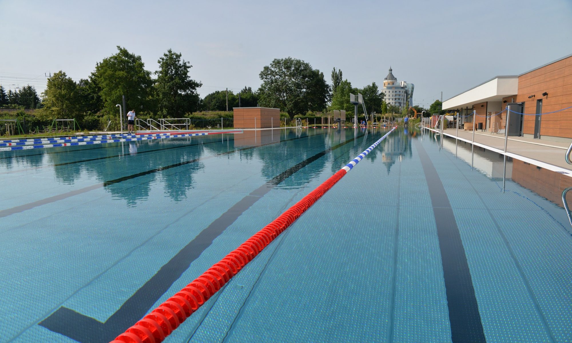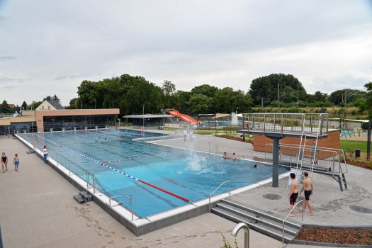 - Das Schwimmbecken des Freibades hat fünf 50-Meter-Bahnen und drei 25-Meter-Bahnen.