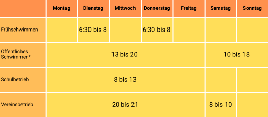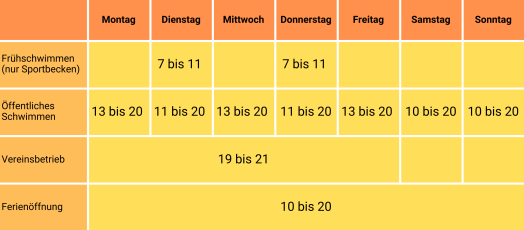 - Öffnungszeiten während der Winterferien (9. bis 22 Februar 2026): Montag bis Freitag 10 bis 20 Uhr geöffnet, am Wochenende 10 bis 18 Uhr geöffnet. Das Frühschwimmen an den Dienstagen und Donnerstagen findet wie gewohnt von 6:30 bis 8 Uhr statt.